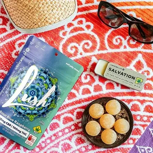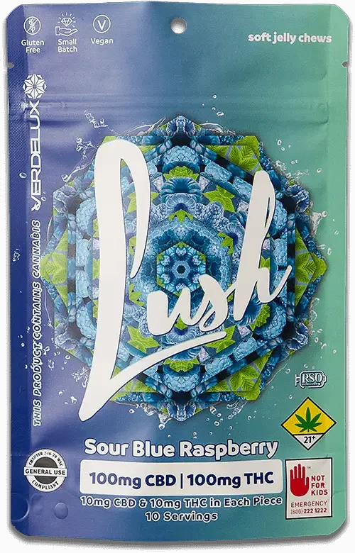 Experience the bold and tangy flavor of Verdelux's Lush Sour Blue Raspberry THC | CBD Cannabis Edible gummies. These soft chews offer a convenient and delicious way to consume the strongest edibles in Washington State.
